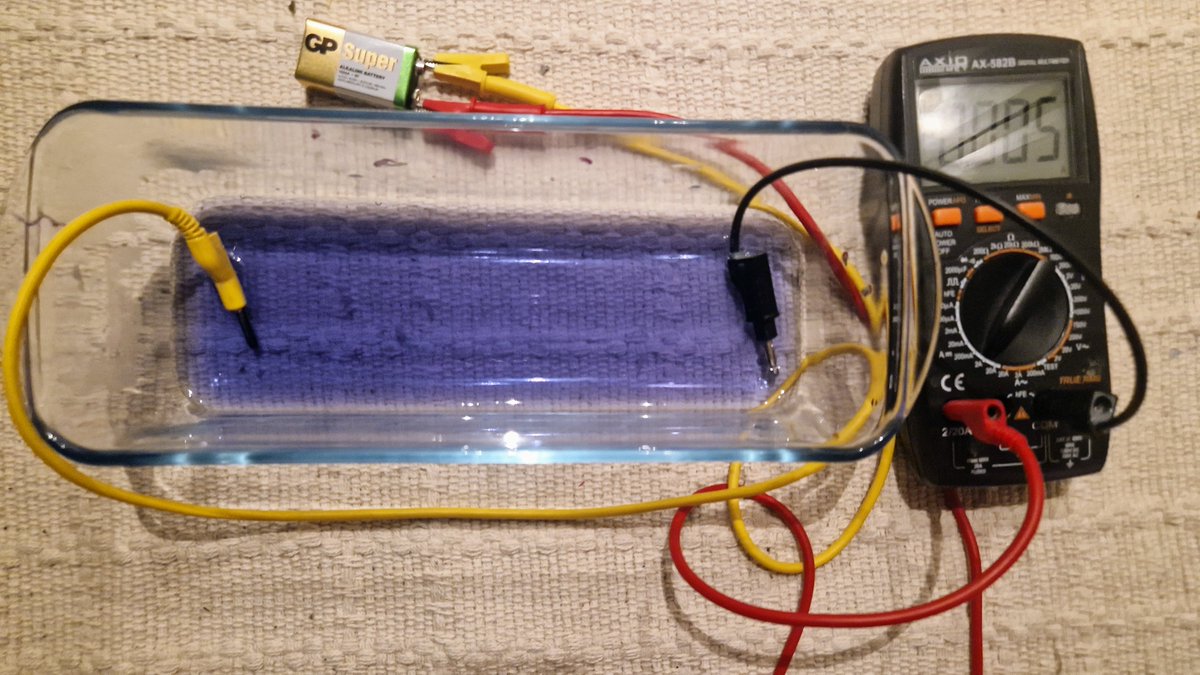 We will use a regular 9 volt battery as the power source, added a little bit of salt to increase the current to 0.005 ampere. This setup is inefficient, so we will we wait a few hours now..