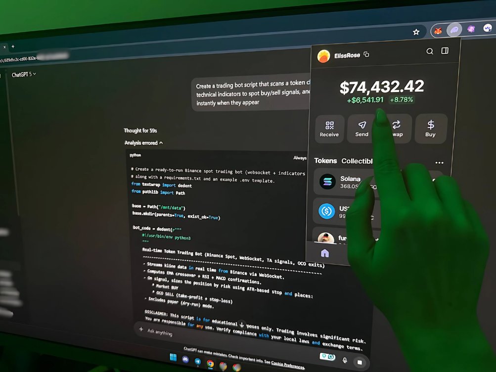 1️⃣ Step: ✥ Open ChatGPT5 and tell it you want a trading bot template ✥ We need our AI to write a script that analyzes a token chart and makes trades automatically ✥ Here’s a prompt you can use: "Create a trading bot script that scans a token chart in real time, uses
