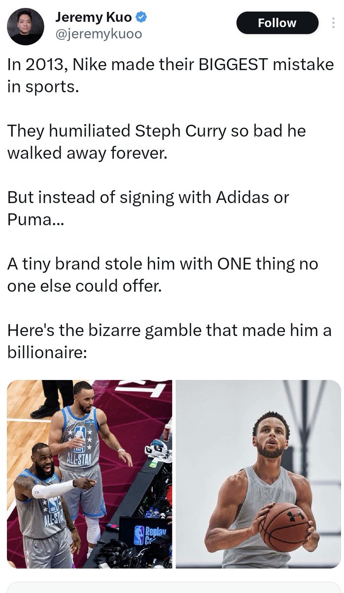 En 2013, Nike cometió su peor error en el deporte. Humillaron tanto a Steph Curry que lo abandonó para siempre. Pero en lugar de firmar con Adidas o Puma... Una pequeña marca lo robó con una cosa que nadie más podía ofrecer. Esta es la extraña apuesta que lo convirtió en