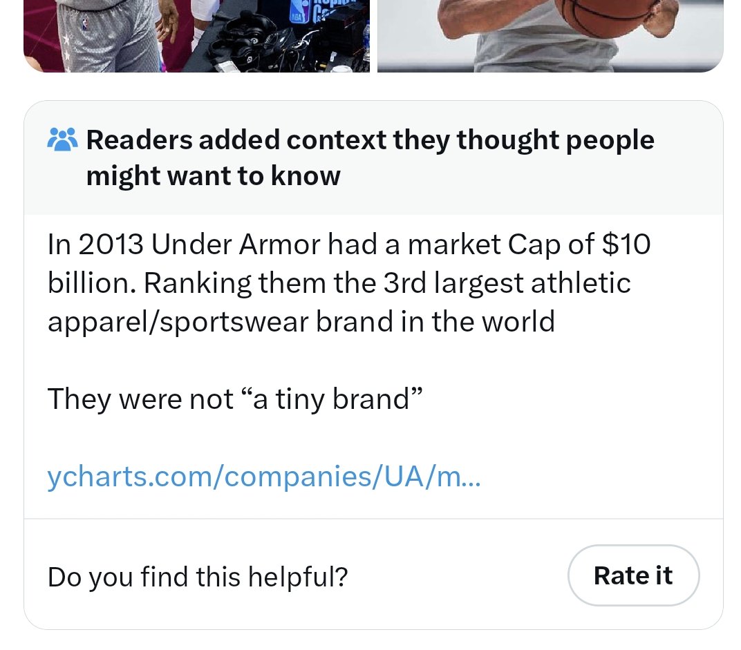 @jesus_osorior Coges un texto en inglés, lo traduces y te quedas tan ancho? Pese a que el original tiene una nota se comunidad que deja claro que en esa época Under Armour no era "una pequeña marca" sino la 3ª marca deportiva y con millones de facturación.