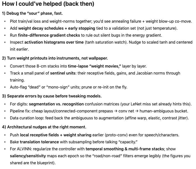 Hinton ~1983 thought Boltzmann Machines > backprop, but debugged himself out of the infatuation Boltzmann Machines failed to learn, so he printed out weights, 8 cm thick, and inspected them for weeks it's the dreaded local minimum so 1 yr later, in desperation, he tried backprop