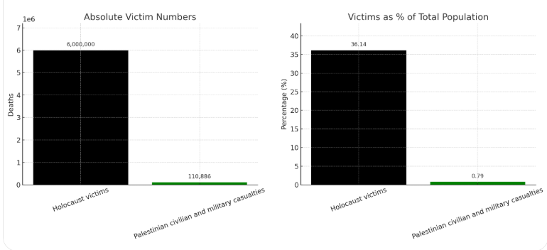 Behalve dat Israƫl duidelijk en aantoonbaar niets heeft begaan dat op afstand vergelijkbaar is met de Holocaust. Bij het dagelijkse aantal burgerslachtoffers van het conflict sinds 1948 zou het 12.600(!) jaar duren voordat het aantal op 6 miljoen komt. Bij het dagelijkse aantal