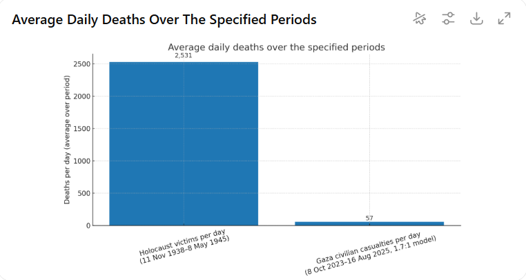 Het bovenstaande aantal omvat ALLE militaire slachtoffers omvat, dus het aantal burgerslachtoffers is noodzakelijk lager. Laten we nog even kijken naar het aantal burgerslachtoffers van de oorlog in Gaza/dag en het aantal slachtoffers van de Holocaust/dag. Ik hoef u niet te