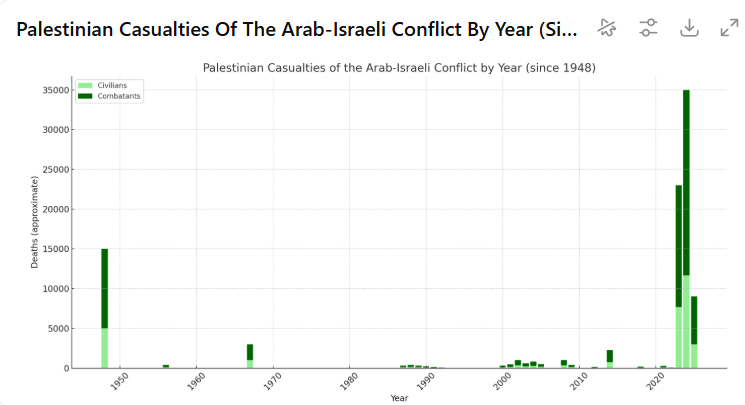 Wanneer geconfronteerd met dit argument van militaire noodzaak na 7/10, schakelen de meer fanatieke holocaust-bagatelliserders over op de bewering dat ādit al sinds 1948 aan de gang isā. Wanneer we het aantal slachtoffers sinds 1948 vergelijken, zowel absoluut als relatief,