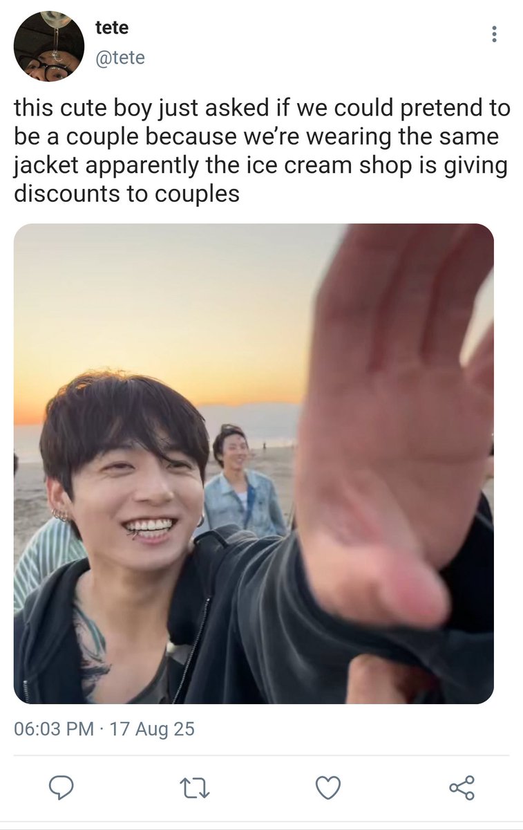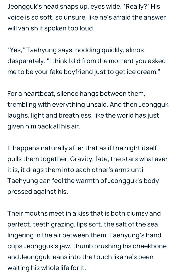 #taekookau where a boy at the beach approaches taehyung and asks him to pretend to be his boyfriend so they can snag the couples discount at the ice cream shop