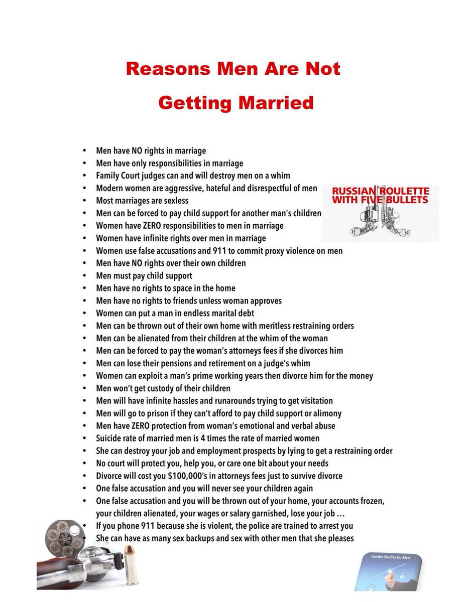 @akafaceUS A large part of it is, we've all seen men get cut in half by women in divorce, and also seen countless women proudly proclaim it's all about money for them. Sex and relationships is one thing, having enough confidence to marry and choose the mother of your children is another.