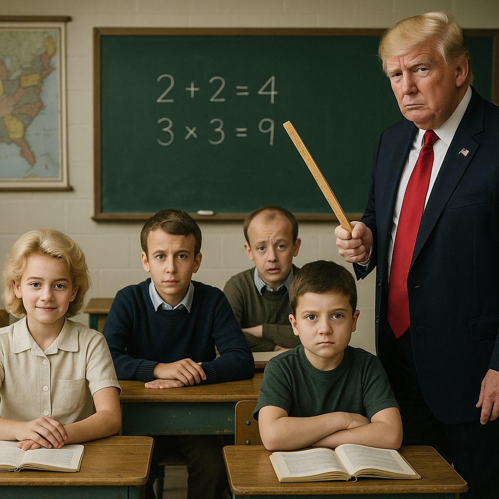 Nie jestem aż tak dobry w AI. Czy ktoś mi wygeneruje obrazek następujący: w ławkach szkolonych siedzą, jako dzieci, Ursula von der Leyen, Macron, Merz, Żeleński. Obok stoi Trump jako nauczyciel z linijką do karania po rękach niegrzecznych uczniów. Z góry dziękuję :)