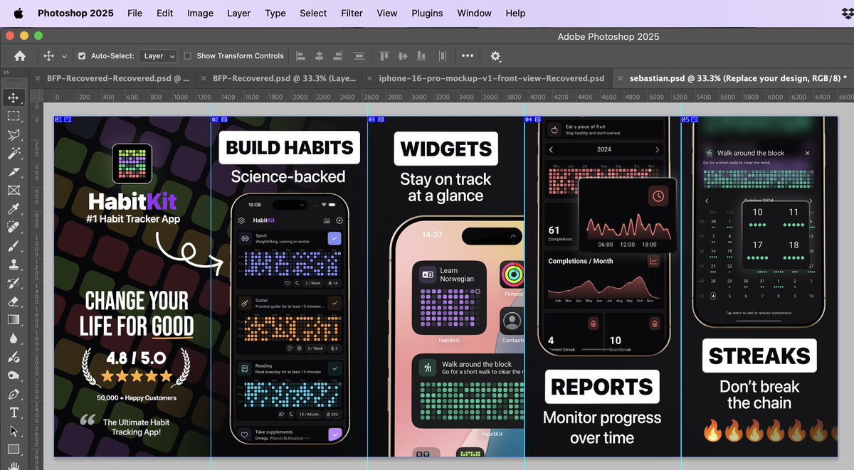 FIRST ONE DONE!! ✅ For my FREE SCREENSHOT Project I had the absolute pleasure of working with the fantastic @SebastianRoehl for his well known app @HabitKit I made the initial designs then after consultation and feedback from Sebastian this is where we've landed We'll be