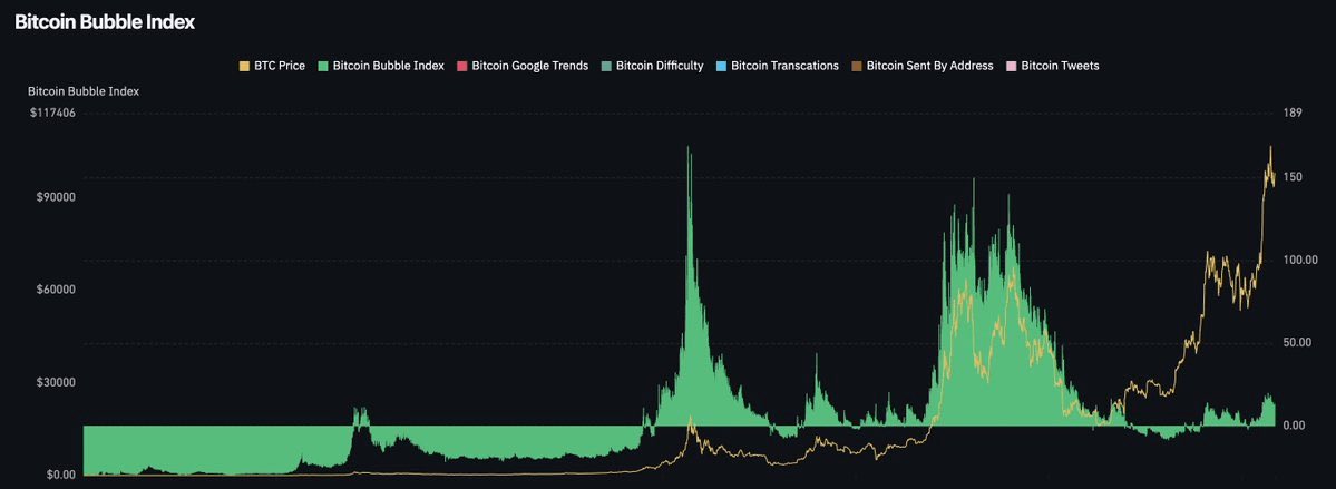 Golden Ratio Multiplier is at $121,971 — risk starts showing up past $135,522 Smithson’s model shows $53k now, with a possible top between $175k and $230k Bottom line: core indicators still haven’t entered the danger zone Up next, we’ll break down key sentiment and behavior