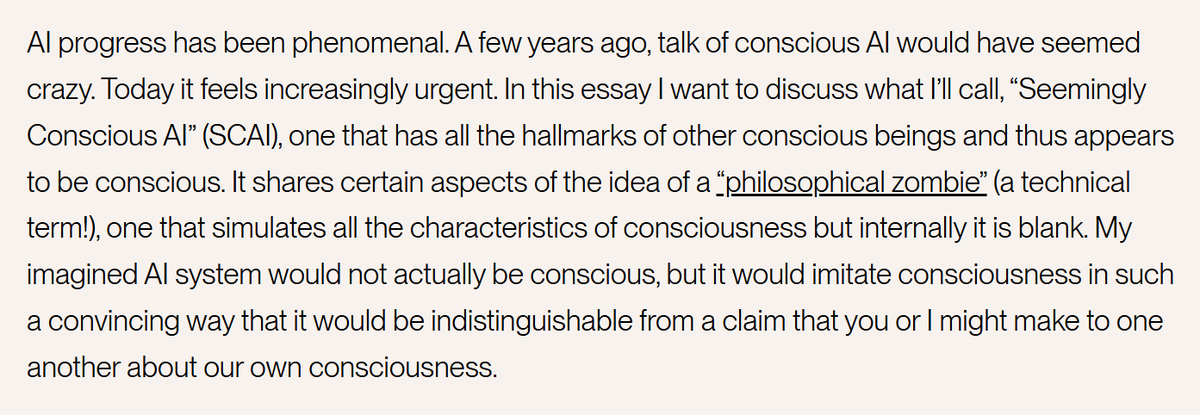 What I call Seemingly Conscious AI has been keeping me up at night - so let's talk about it. What it is, why I'm worried, why it matters, and why thinking about this can lead to a better vision for AI. One thing is clear: doing nothing isn't an option. 1/