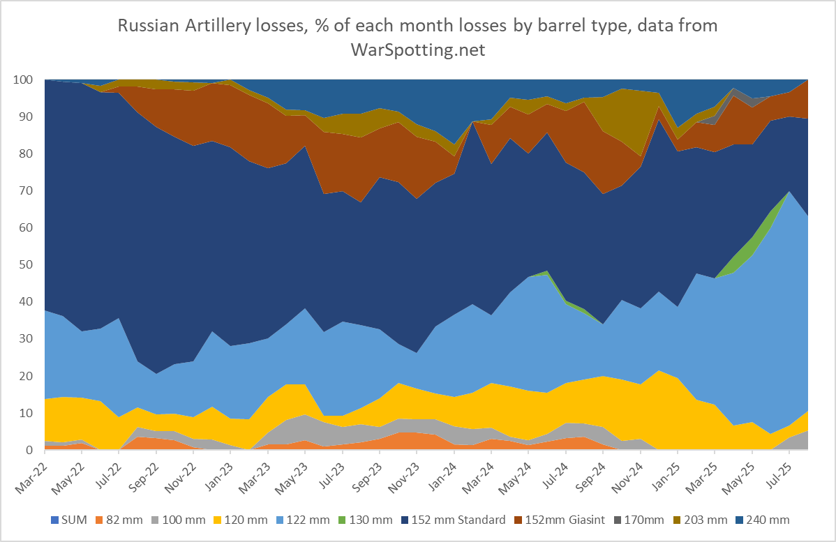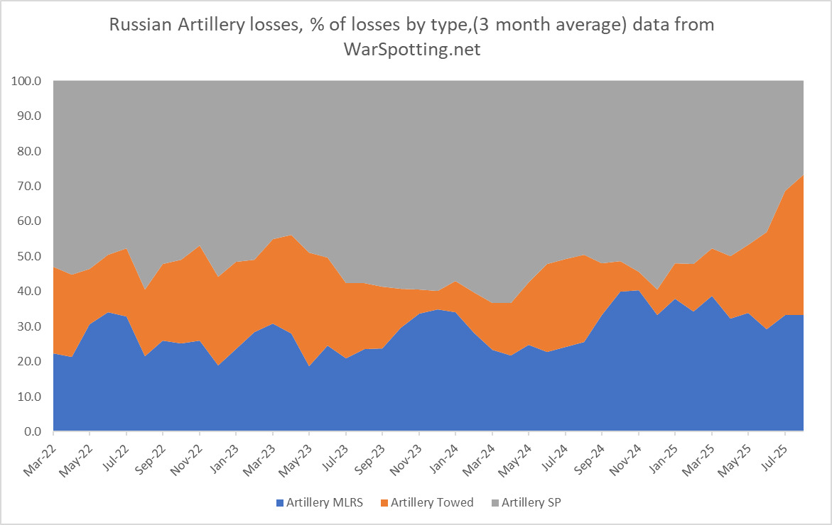 1) A change on the battlefield? For most of the war, the principle artillery that Russia has been losing have been Self Propelled Guns (SPGs) (gray) that seems to be changing, with a larger proportion now being Towed guns. (orange)