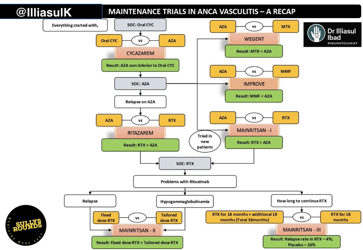 Ever tired of memorizing ANCA vasculitis trials? Hereβs the story behind the studiesβnot just names, but logic, thought process, and how each trial shaped clinical reasoning. π Read. π Reflect. π Repurpose. 𧬠Maintenance in ANCA Vasculitis evolved like this: CYC β AZA β