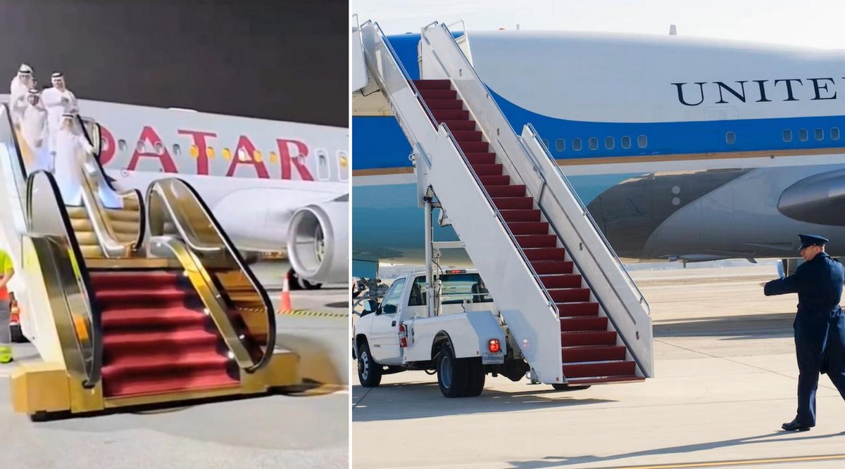 While American leaders take a long walk down from their aircrafts with an ordinary stair truck, the generous Qatar royal family who gifted a 747 private jet glide down their flying palaces in utmost style using a gold-plated mobile escalator - | https://luxurylaunches.com/cel...