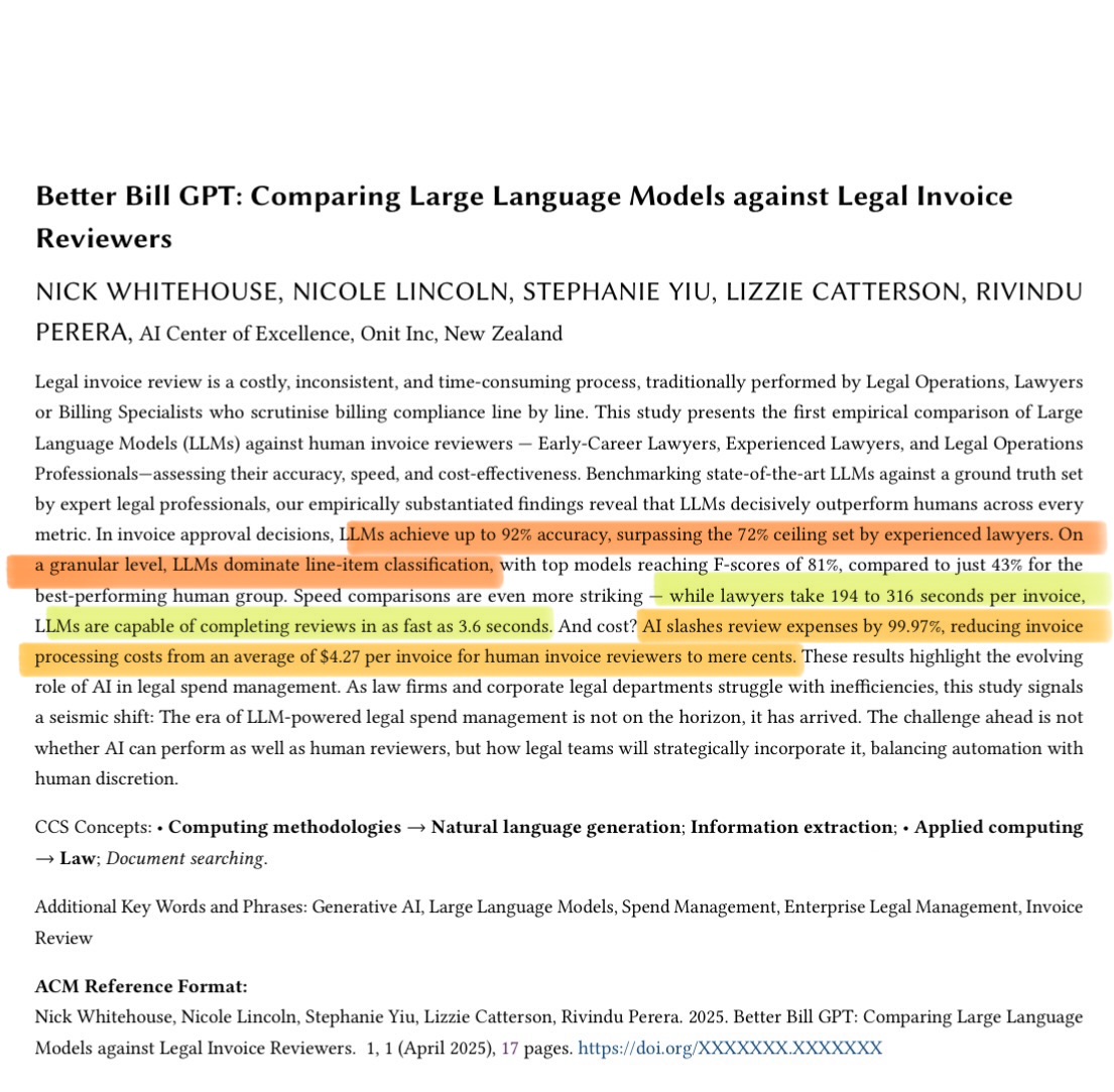 @deedydas Invoice review is a paralegal task. This tells us nothing about how AI outperforms on actual work experienced lawyers do.