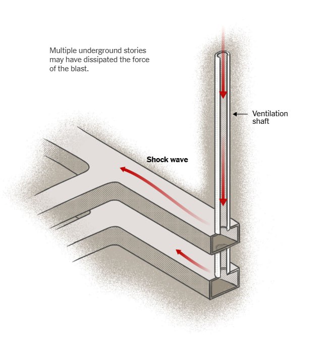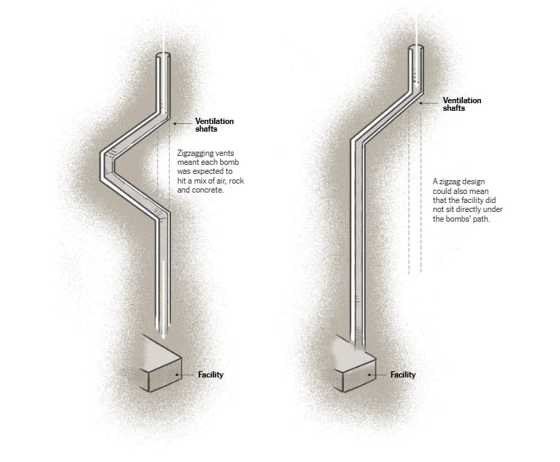 10/ سنگهای سخت کوه اجتناب کنند. یکی از مقامات پنتاگون بین کرده: «شفتهای اصلی مستقیما به پایین نمیرفتند. آنها در بخش بالایی تا حدودی انحراف و زیگزاگ داشتند، به این معنی که مسیر رسیدن به سالن اصلی غنیسازی فردو تا انتهای مسیر تهویه مستقیم نبود».