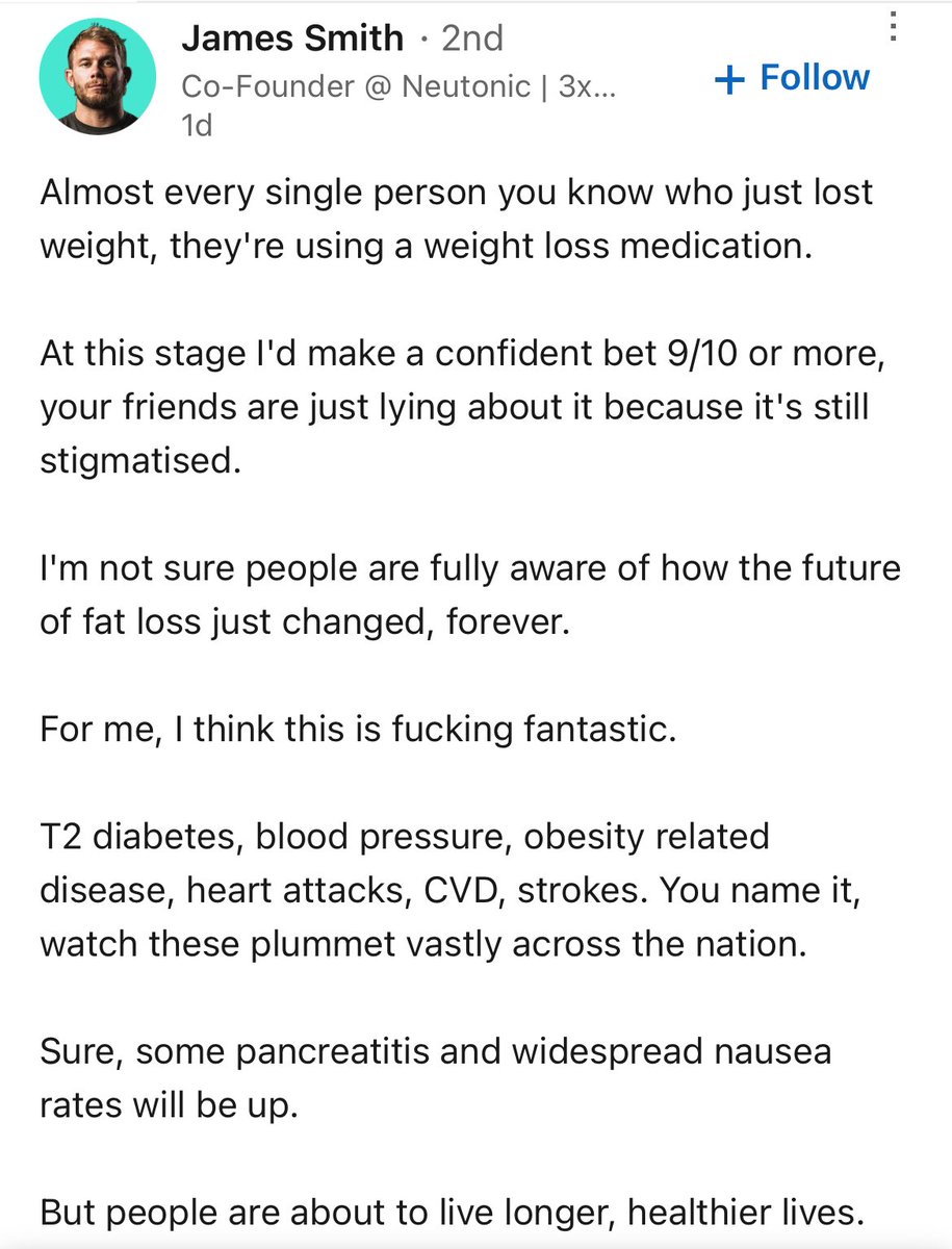 @yoursimmo Of course it has side effects. Like all drugs, it’s a balance of risks and benefits. Morbid obesity and diabetes cause a heck of a lot more health problems than ozempic. For example, diabetes itself is a major cause of neuropathy and vision loss. But this is why only people who