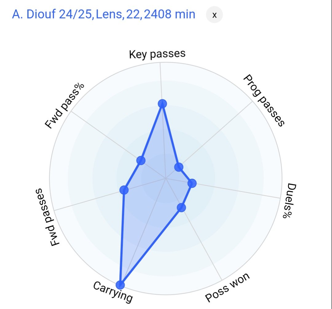 Una specifica difensiva ottima sono i recuperi palla. Questi dicono, infatti, 6.23 a partita, sia in zone alte che basse del campo. Grazie alle sue leve lunghissime, #Diouf sradica i palloni come una piovra, e occupa il 90esimo percentile nei top 5 campionati in questa stat.⬇️