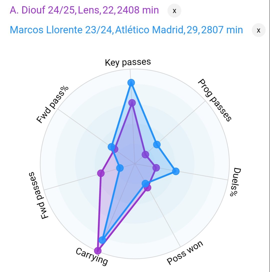 Se volessimo trovare un paragone per #Diouf, quello sarebbe sicuramente Marcos #Llorente dell'#AtleticoMadrid. Entrambi giocatori estremamente verticali, maggiormente offensivi, ma che agiscono partendo dal basso per risalire il campo con la palla al piede tramite conduzione.⬇️