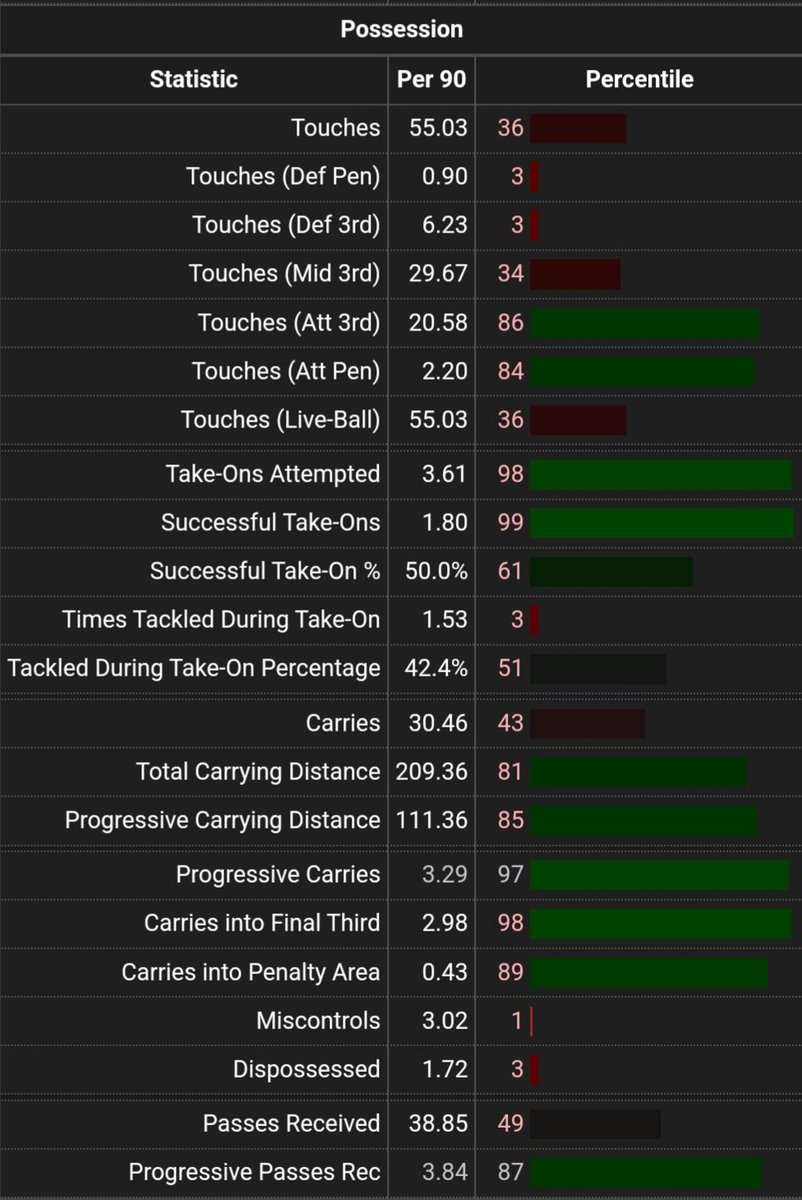 Infatti, il francese primeggia per conduzioni progressive (97esimo percentile), conduzioni nell'ultimo 3º di campo (98esimo) e 1v1 riusciti, con 1.80 a partita (99esimo perc). Questi non sono degli 1v1 tecnici, ma quasi sempre, sono presi in velocità con lo slancio della corsa.⬇️