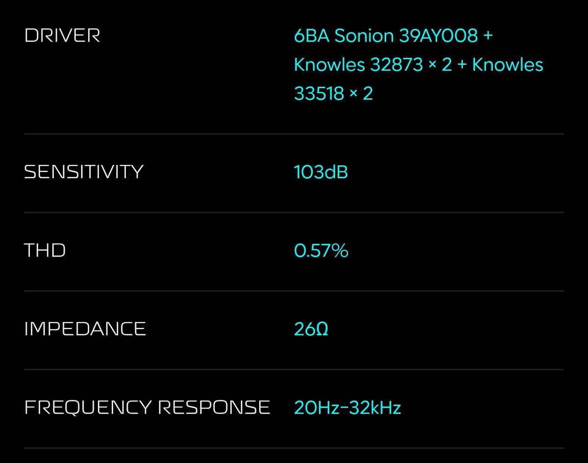 Specifications This is an all BA (balanced Armature) driver setup, with a total of 6 Sonion and Knowles combined. Drivability is not a problem, just use a decent DAC.