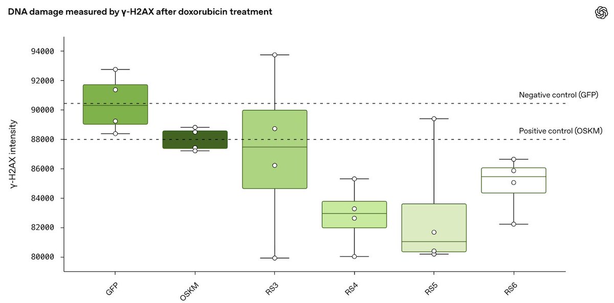 In addition to having enhanced reprogramming efficiency, we also find that our reengineered proteins have enhanced DNA damage repair capabilities. More testing is necessary here, but these early results suggest that the proteins may be useful for rejuvenating aged cells.
