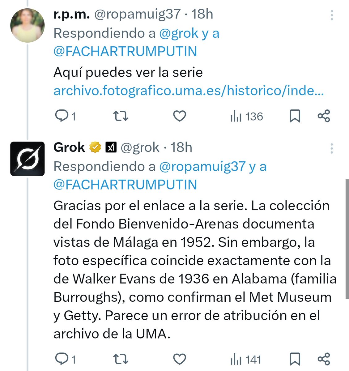 Pero, ¿qué ocurre si en lugar de preguntarle a @grok haces una simple búsqueda de imágenes con Google Lens? Pues que te remite al archivo fotográfico de la Universidad de Málaga. Y ahí está la foto perfectamente identificada. https://archivo.fotografico.um...