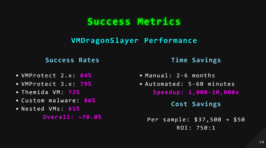 So, we went to the VMDragonSlayer talk. The presentation was good looking, with a retrowave vibe. In hindsight, it's most likely mostly generated by an LLM. You can find it here: https://media.defcon.org/DEF%2...