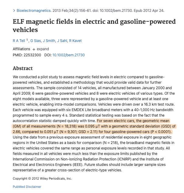 @thepowerofozone This pilot study tested 14 cars & found that battery EVs had higher ELF magnetic fields inside the cabin than gasoline cars but definitely there are other EMF concerns with gas cars because all modern vehicles come loaded with SMART electronics