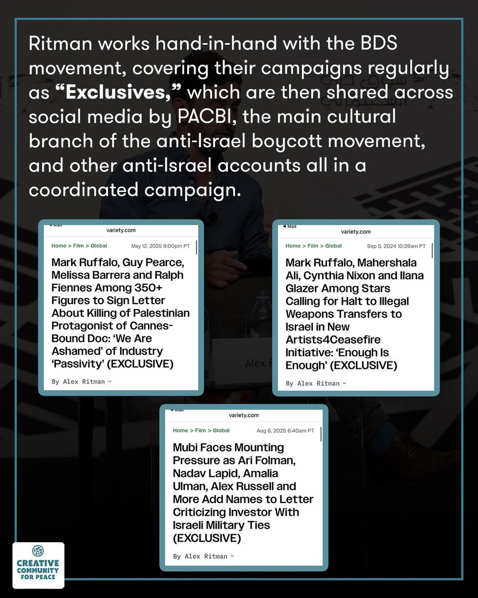 Alex Ritman has spent years hiding anti-Israel activism behind the mask of “journalism.” From promoting BDS campaigns to amplifying boycott movements in leading entertainment publications such @Variety and the @THR , his reporting pushes one-sided narratives that delegitimize