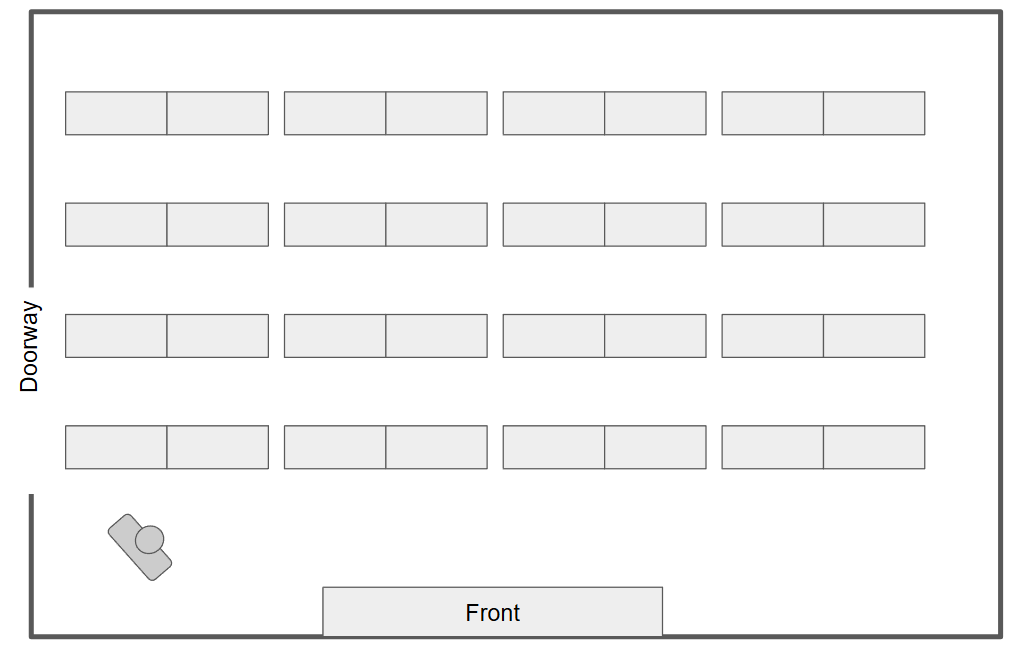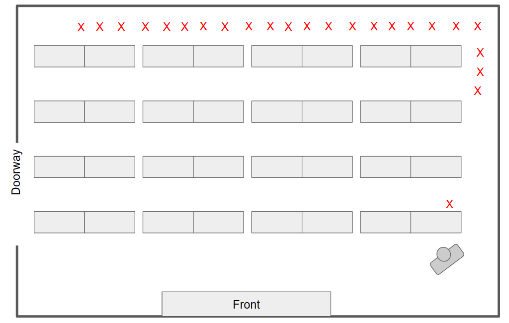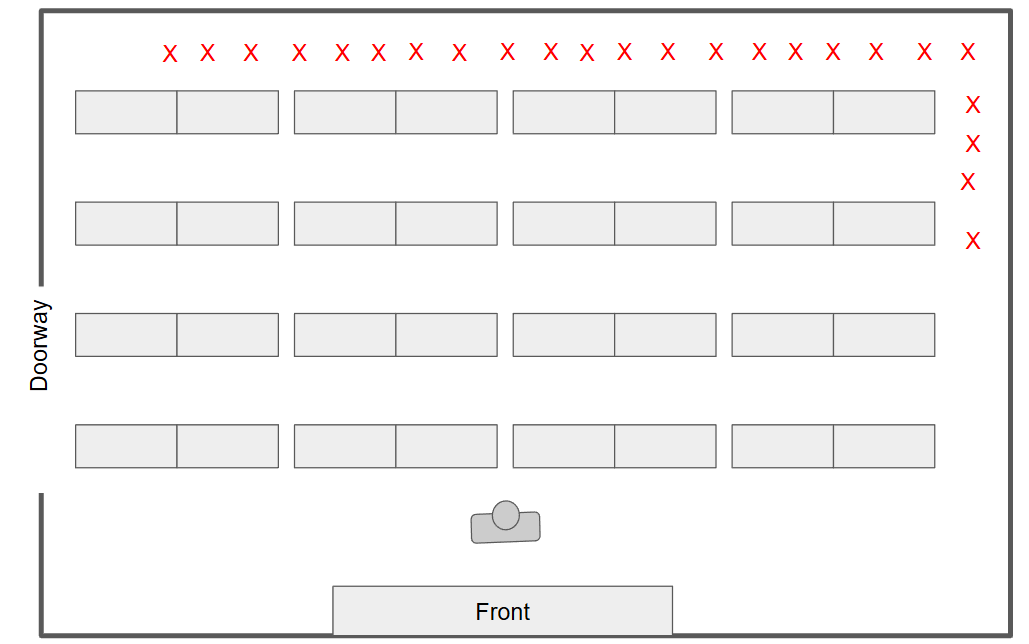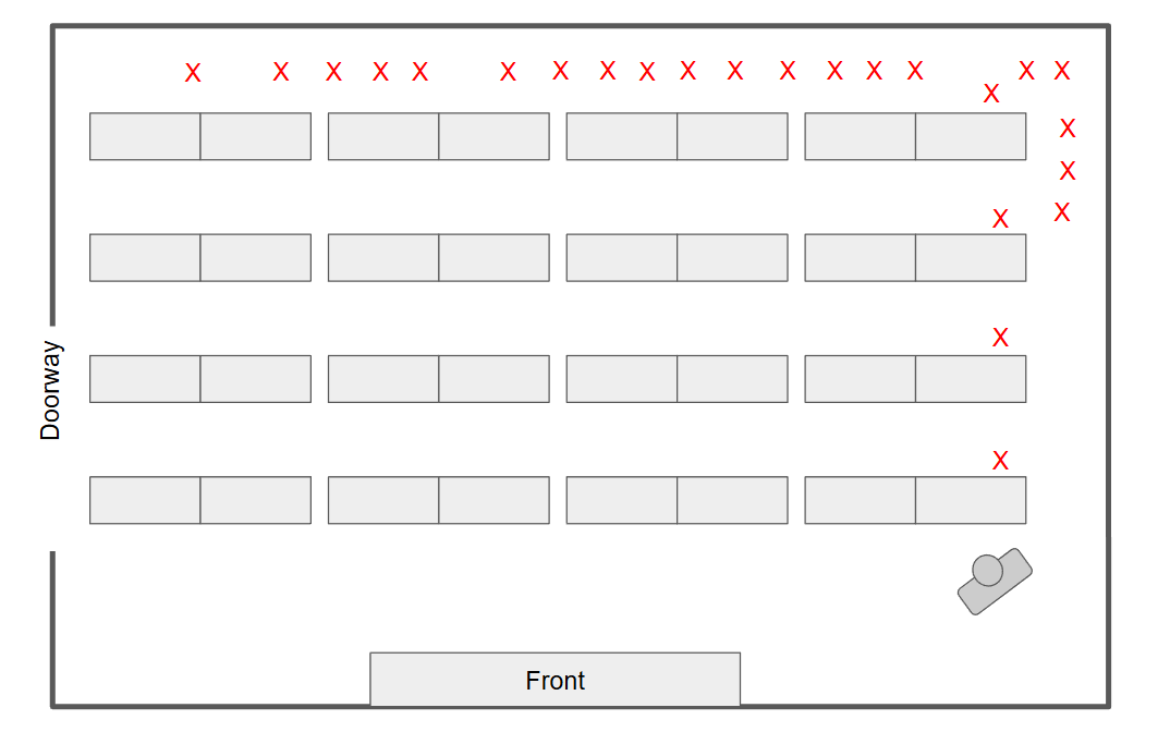 I go column by column, till the room is full. I pause inbetween each column, to check that everyone is working, and that remaining students are quiet. I then hit my Perch and wait till everyone is deep in the work.
