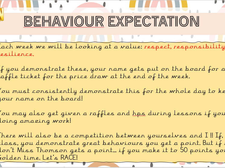 And that's it. Critical things are to: Be slow, pause inbetween instructions to check everything has been done correctly. Show, not tell. Expectations are lived and breathed, and children don't need lengthy discussions of them. Just crack on with the work and set the tone.