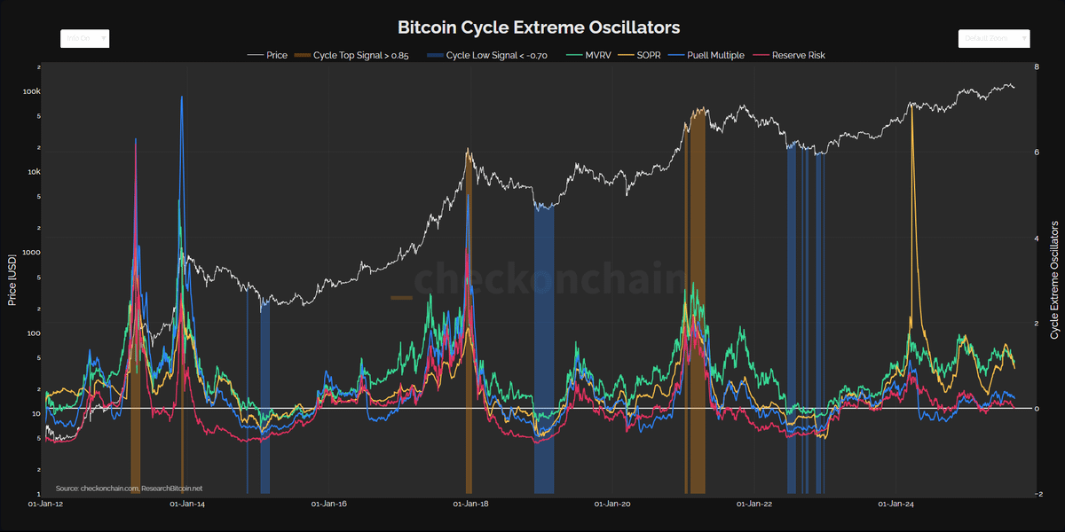 I rely on a set of 5 indicators that have never failed at market tops: 1. BTC Extreme Oscillators 2. MVRV Bands 3. Pi Cycle Top 4. On-chain Price Models 5. BTC Index Performance Next, we’ll break down how to interpret them correctly