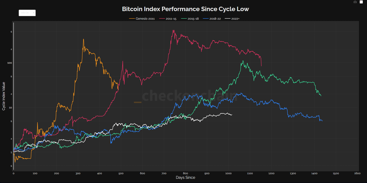 5. BTC Index Performance Since Cycle Lows This indicator compares the current cycle’s performance with previous ones from market bottoms Today we are at ~day 940 after the 2022 bottom In previous cycles, peaks were at 1050–1100 days, so time to the top is limited