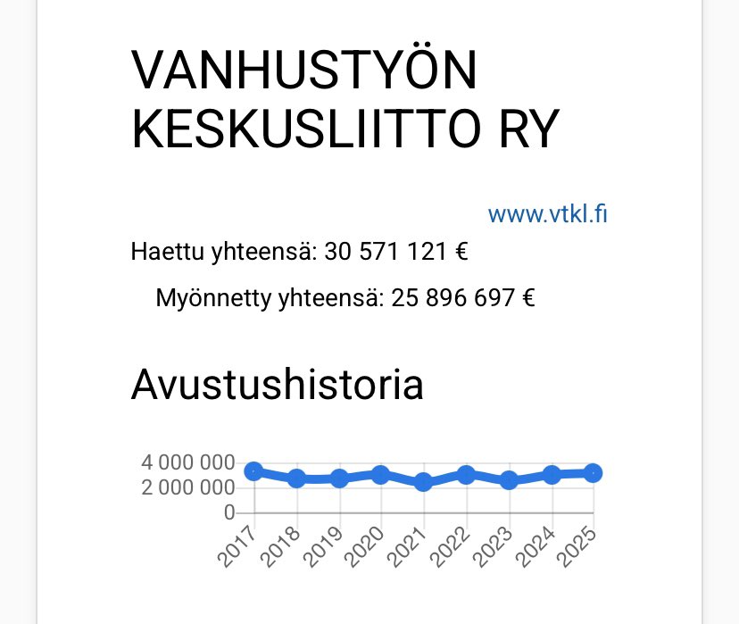 @mikamerano Hyvä! Tarkennus tuohon laskemaasi hintaan; Summassa on vain viimeiset vuodet. Todellinen summa on huomattavasti suurempi, sillä tämä liitto on perustettu jo 1971. Lisäksi liittoon kuuluu 14 piirijärjestöä ja 150 paikallista senioriyhdistystä, joilla on oma rahoitus+avustukset.
