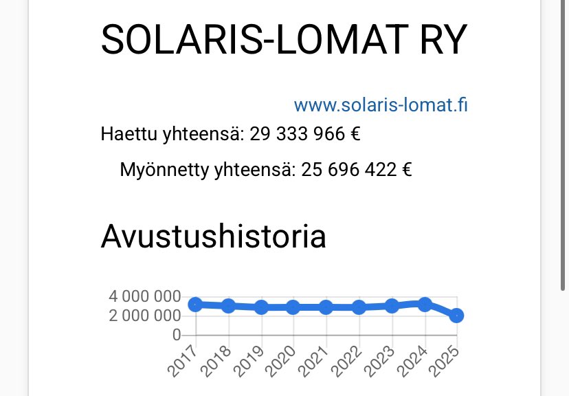 18/X Yhdistys: Solaris-lomat ry Puolue: vasemmistoliitto Hinta veronmaksajalle: 25 696 422 euroa (2017-2025) Taustaa: Solaris-lomat ry on perustettu 1965 ja se tarjoaa sosiaalisia lomia niille, jotka ovat ”lomatuen tarpeessa tai syrjäytymisvaarassa”. Yhdistys omistaa myös