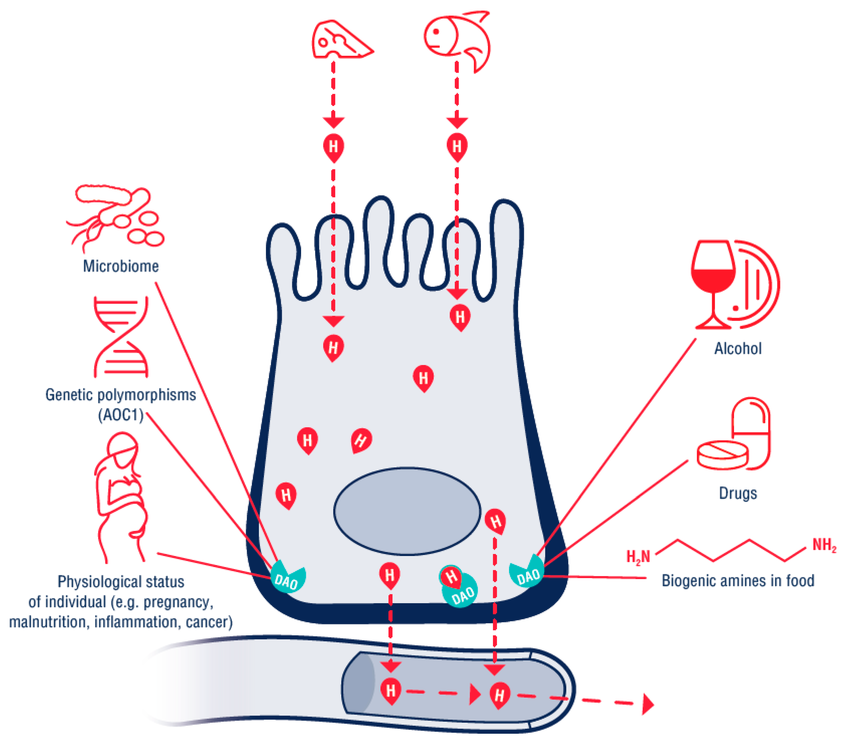 Now let’s dive deep into another very interesting and important gene, DAO. Diamine Oxidase is an enzyme your body uses to break down histamine, especially in your gut. It’s made thanks to the AOC1 gene and helps your body handle histamine coming in from external things like