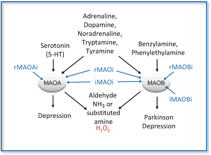 Now let’s talk about MAO. Monoamine oxidase enzymes are mitochondrial enzymes that catalyze the oxidative deamination of amines (including neurotransmitters and dietary xenobiotics) converting them into aldehydes, ammonia (NH₃), and hydrogen peroxide (H₂O₂). For example,