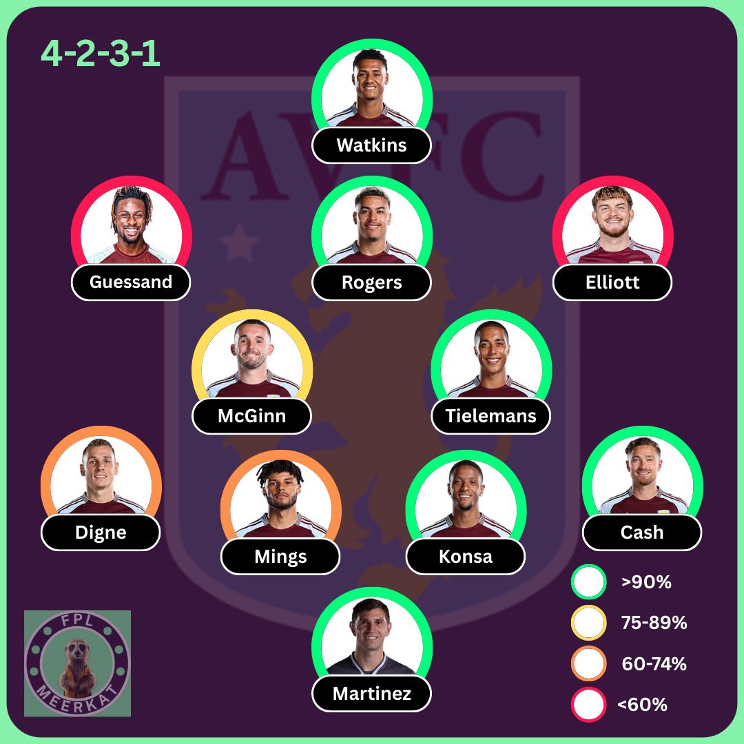 ASTON VILLA: (85%) 🆕 Elliott, Digne, Martinez ⚠️ Onana, Kamara, Barkley Harvey Elliott to get his debut I’m not confident on the wingers hence the red circles, could also be Rogers left, Elliott central, Malen on the right It’s a fun team though!