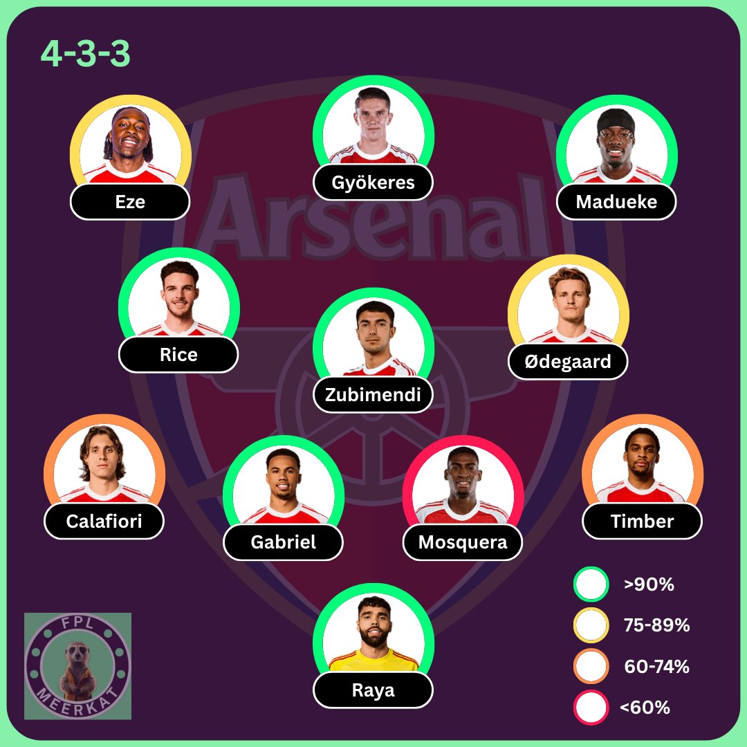 ARSENAL: (88%) 🆕 Eze, Mosquera ⚠️ Saliba, White, Saka, Nørgaard, Havertz, Jesus With Saka out Madueke should be locked for that right wing spot White and Saliba have a chance to feature, knocking the chances of Timber and Mosquera