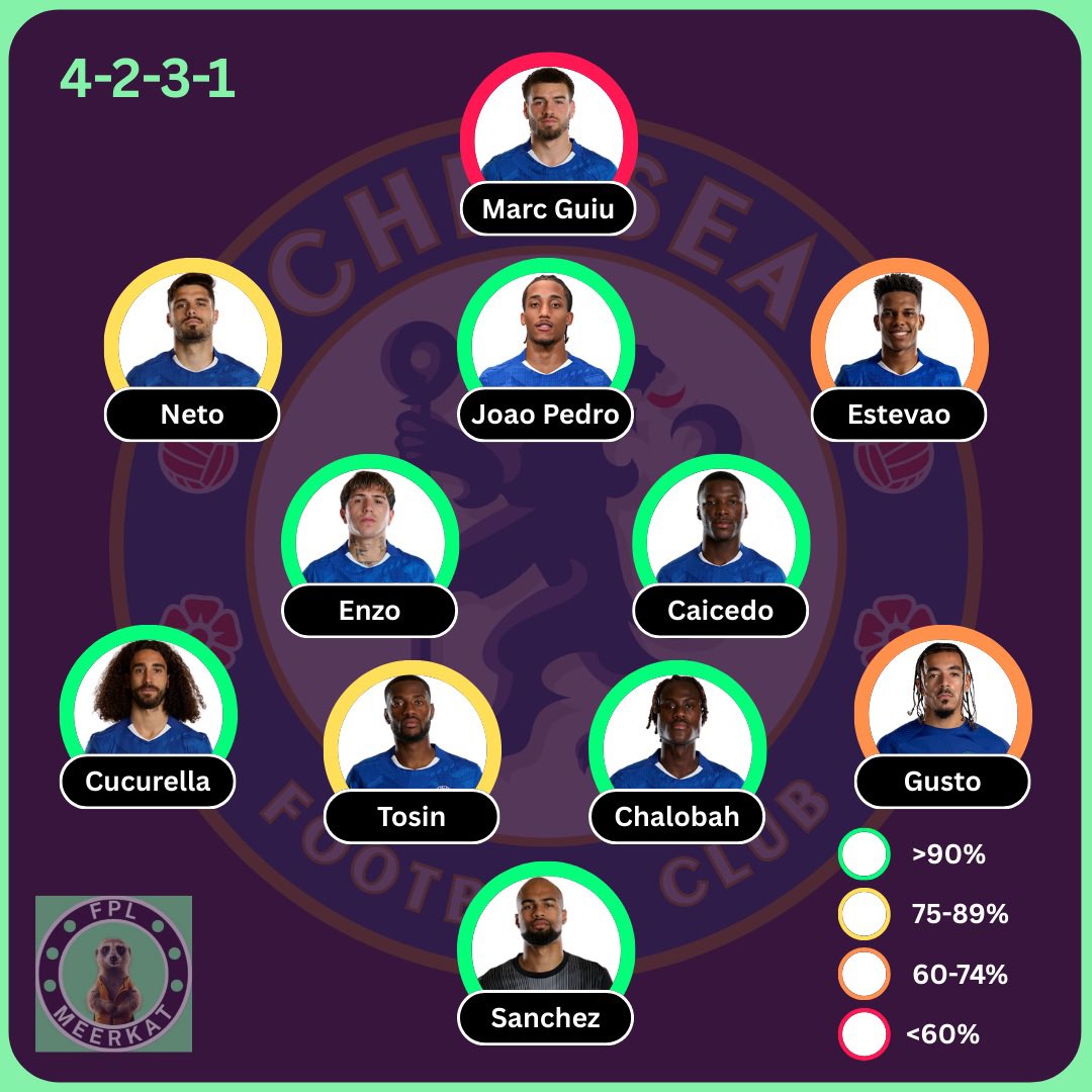 CHELSEA: (88%) 🆕 Marc Guiu ⚠️ Colwill, Badiashile, Palmer, Lavia, Delap Before you yell at me, I am less than 50% confidence on the Marc Guiu start, same goes for anyone else who might play If it’s Joao Pedro up top, it could be a number of different players in the 10