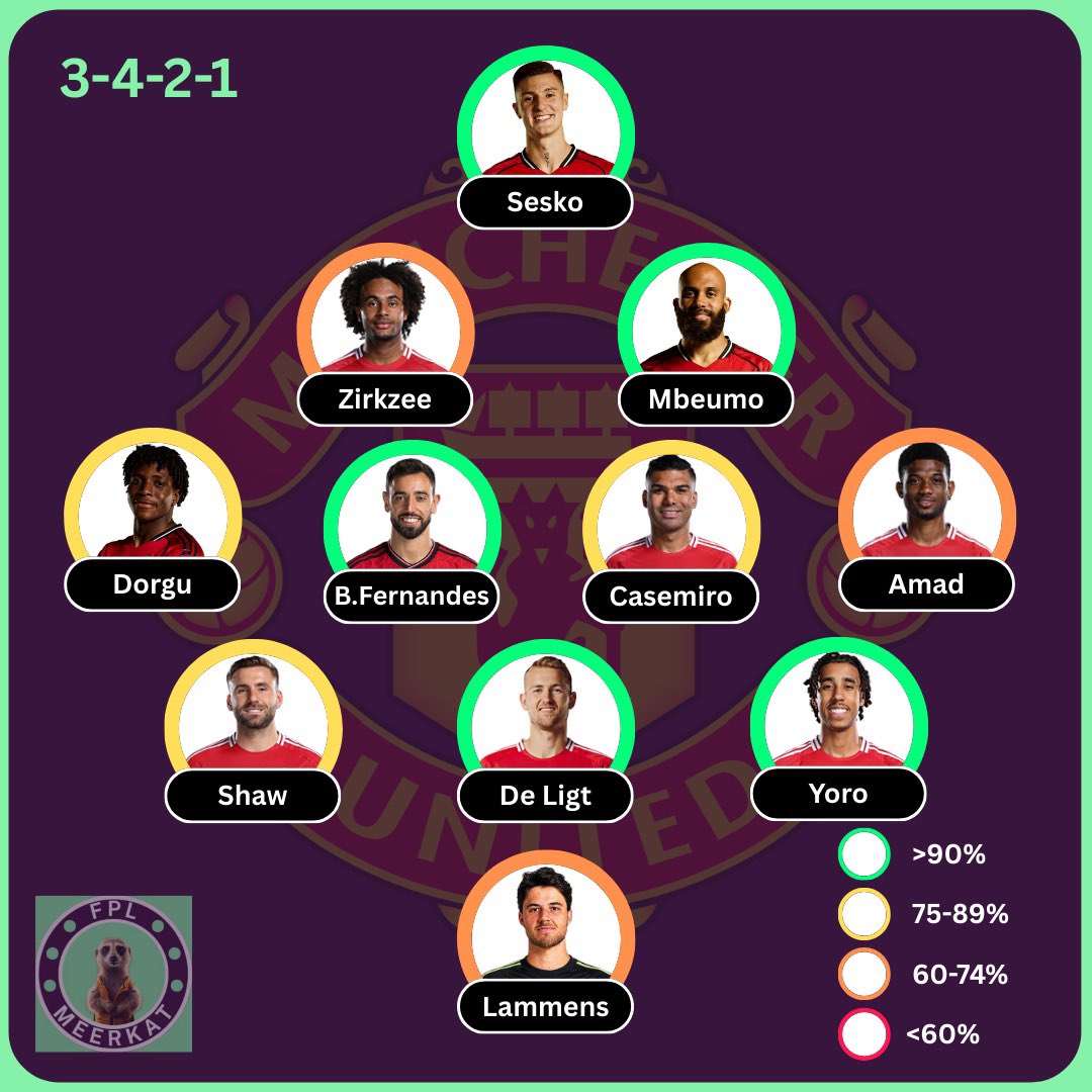 MAN UNITED: (85%) 🆕 Sesko, Zirkzee, Dorgu, Lammens ⚠️ Dalot, Martinez, Mount, Cunha 4 definitively out players for United Should be the lineup, some orange circles just because some moving around might happen Baptism of fire for Lammens!