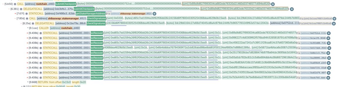 @Shibtoken 3/ Shibaswap rootchain manager contract https://etherscan.io/address/0... uses the stored root Merkle hash in each checkpoint. Somehow, an attack could add a "legit" checkpoint root hash with signatures from 10 signers.