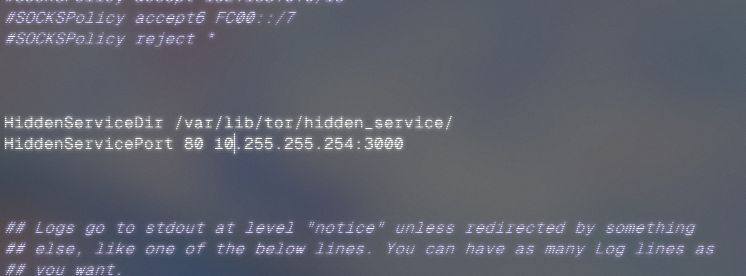 12. paste magic stuff ✨✨ HiddenServiceDir /var/lib/tor/hidden_service/ HiddenServicePort 80 [your network ip]:3000 13. bye nvim > :wq