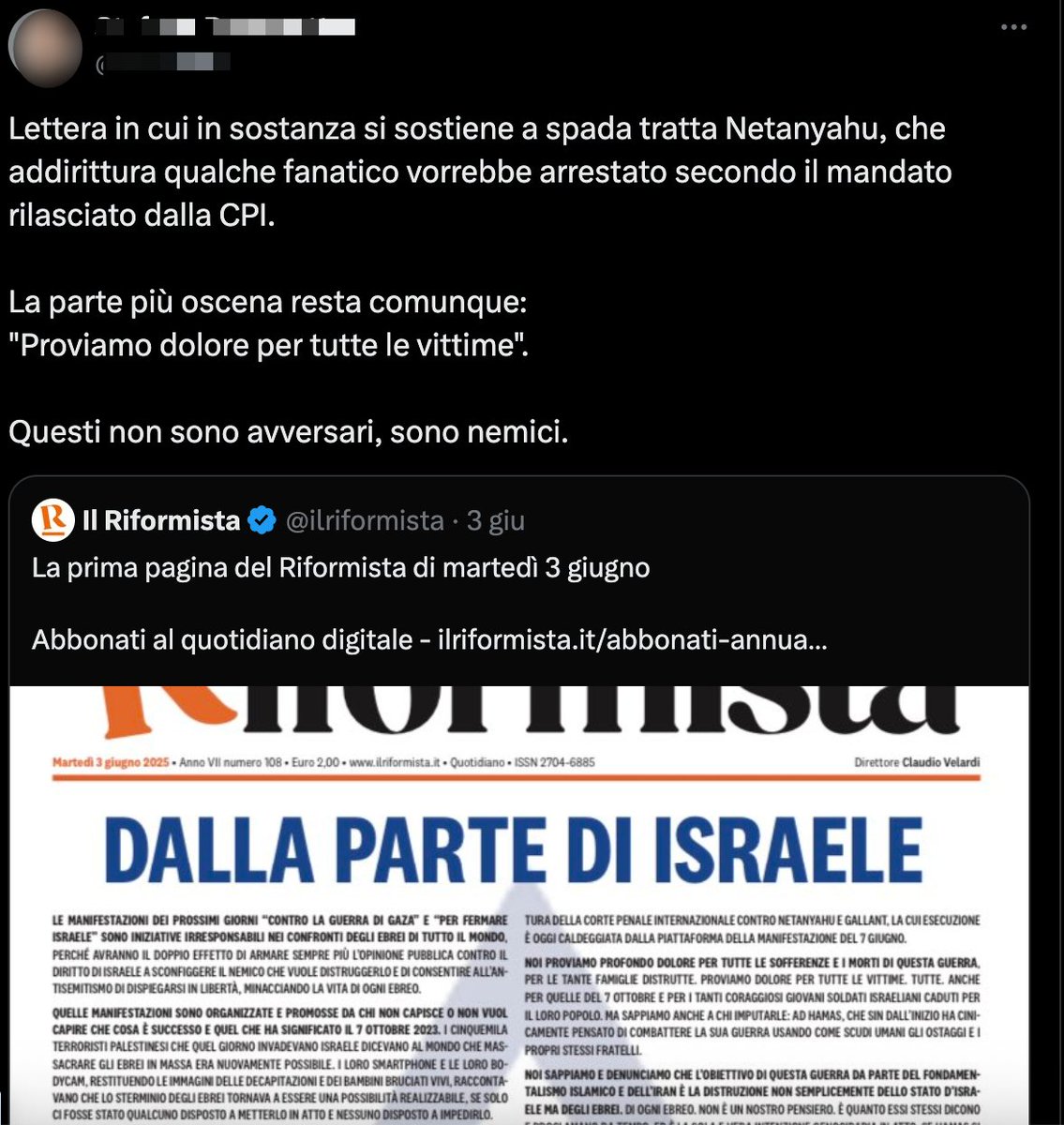 4/19 Lo stesso giorno, la polemica si sposta sui social. Un utente sulla piattaforma @X cita il tweet promozionale dell'appello e scrive: "Questi non sono avversari, sono nemici. Segnatevi questi nomi".