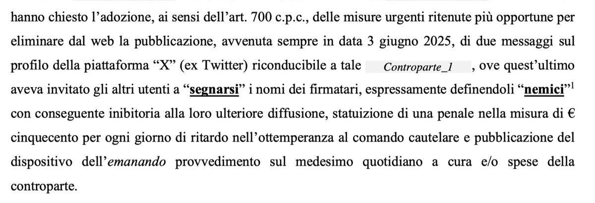5/19 Sette firmatari reagiscono legalmente. Presentano un ricorso d'urgenza ex art. 700 c.p.c. chiedendo in via giudiziale la rimozione del post. La loro tesi è che il post non sia critica, ma una «sconsiderata e pericolosa azione di turbativa» lesiva della loro dignità.