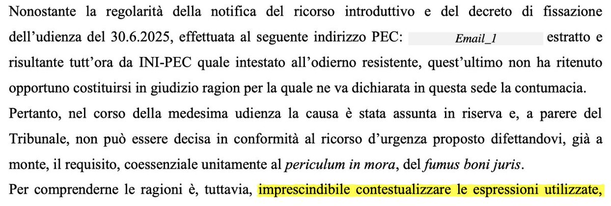 7/19 Ma, nonostante l'autore del tweet rimanga contumace, la decisione del Tribunale è quella di RIGETTARE il ricorso per difetto del fumus boni juris. Il giudice, prima di statuire, afferma che è «imprescindibile contestualizzare le espressioni utilizzate»
