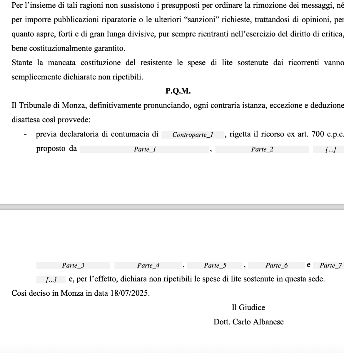 Quando un post sui social smette di essere critica e diventa diffamazione? Possono parole come "nemici" e l'invito a "segnarsi i nomi", in un contesto politico rovente, essere considerate lecita? Il Tribunale di Monza ha dato una risposta netta e articolata. Segue thread 🧵👇