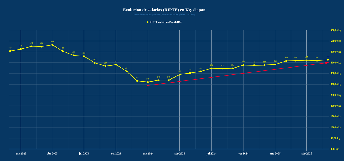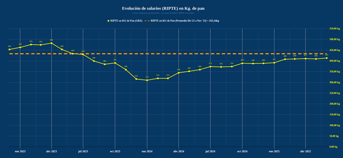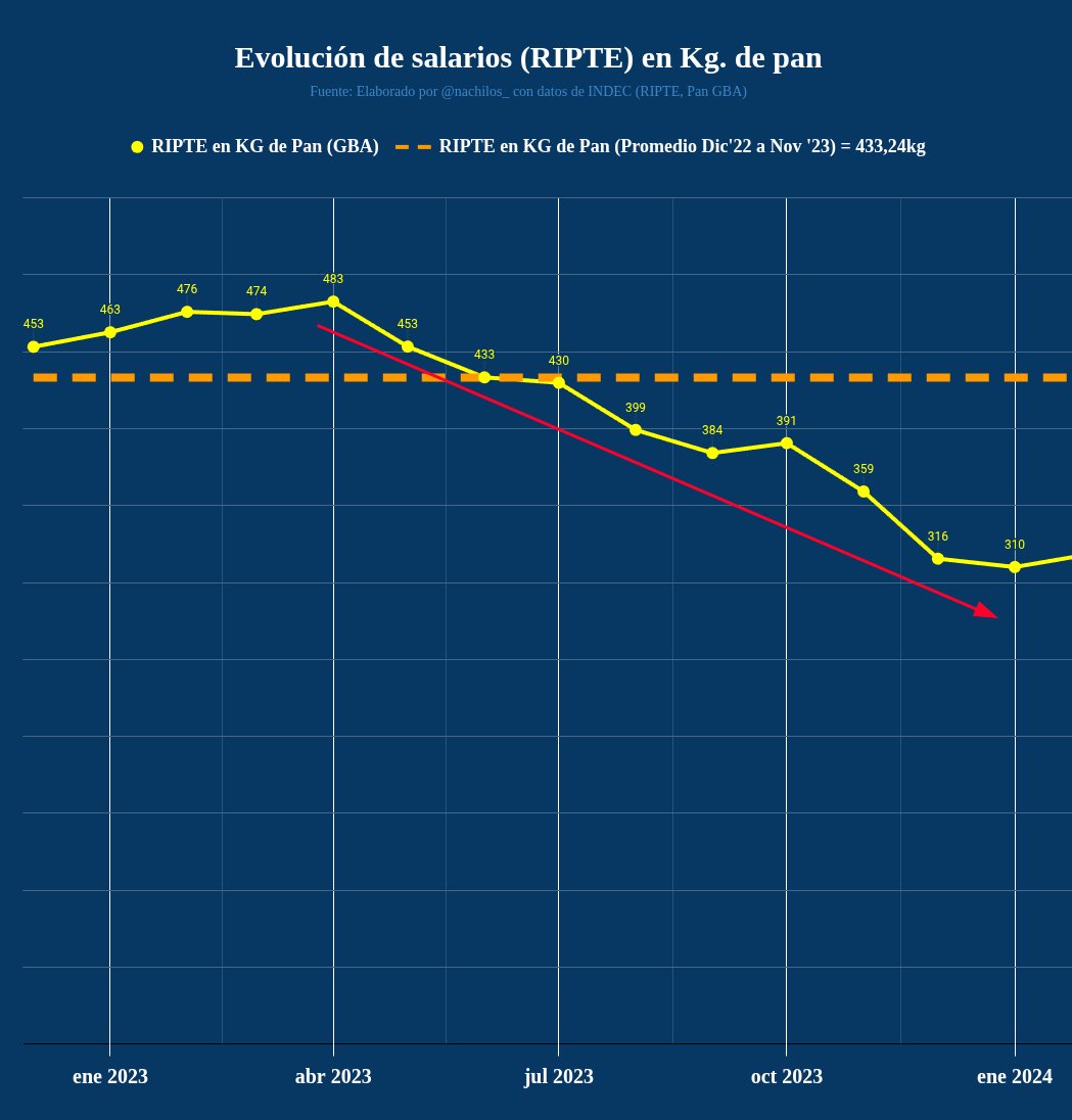 Conclusión 1: Si aceptamos mi métrica (RIPTE medido en Kg de Pan), entre Abril 2023 y Enero 2024 hubo una importante perdida de poder adquisitivo. En Julio 2023 se perforó la línea de promedio que tracé. En general no me gusta señalar responsabilidades pero esto es del gobierno