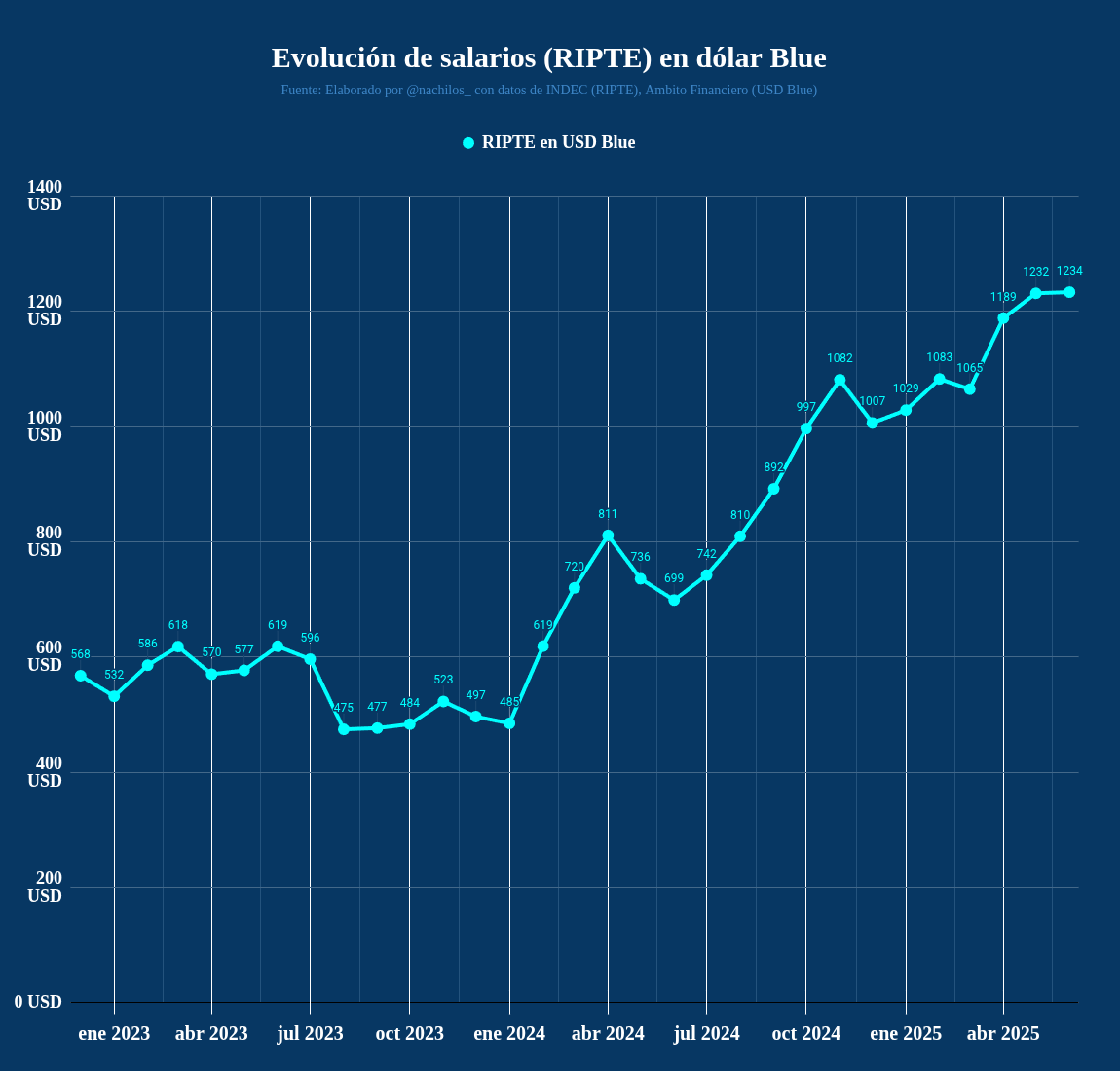 Empecemos con algunas aclaraciones: 1. El RIPTE no es un indicador perfecto del salario. Ya comenté esto en otros hilos, y además no soy experto en el tema. Pero bueno, acá lo usé como un mero ejemplo de referencia. Quizás existan metodologías mejores, incluyendo índices de