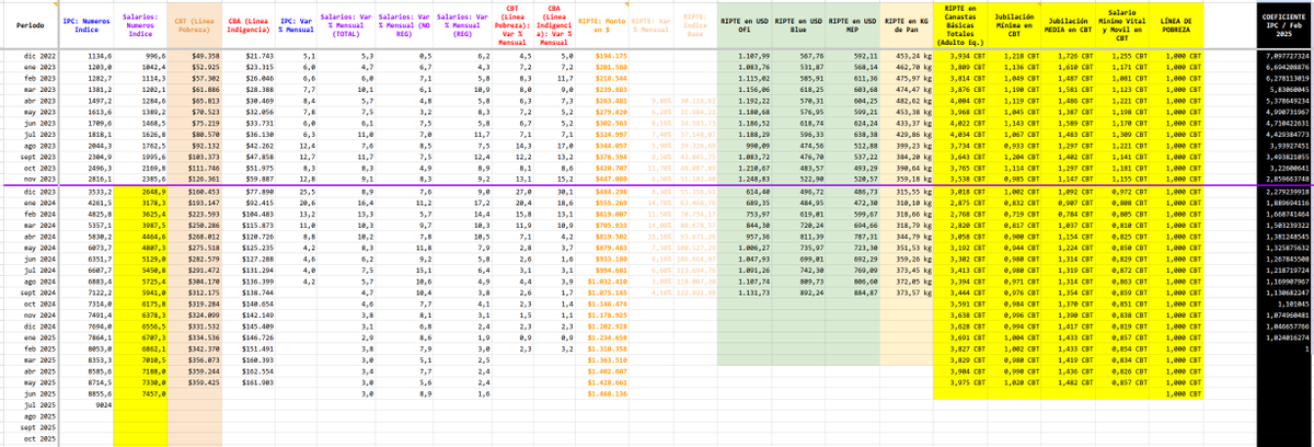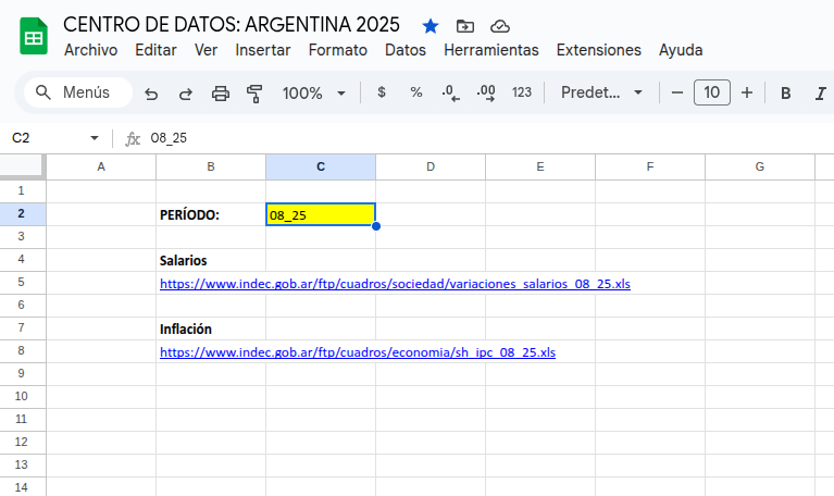 Bueno a ver, por suerte ya tengo un sistema más o menos ordenado para chequear estas cosas. Primero voy a mi planilla y pongo el período Agosto de 2025: "08_25". Eso me facilita links para bajar los últimos datos de salarios e inflación. Acá los comparto x si quieren chusmear: